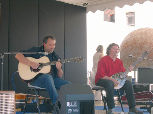 DOMENICA 19 SETTEMBRE Pella Alzo chiesa S. Giovanni Reno Brandoni e Giorgio Cordini: Blues e musica d'autore possono coesistere? A sentire 'Anema & Corde', il loro ultimo Cd assieme, pare proprio di sì. E il riisultato è quanto mai appassionante. Reno Brandoni ha iniziato la sua carriera chitarristica professionale nel 1979 e negli anni '80 ha collaborato e suonato con i più importanti chitarristi dell'epoca come Stefan Grossman, John Renbourn, Dave Van Ronk e Duck Baker. Ha collaborato con Andrea Carpi alle trascrizioni del manuale di "Chitarra Folk" ed ha pubblicato per Happy Grass i due volumi: "le Chitarra di Giovanni Unterberger in tablatura" e "Chitarristi Italiani, la loro musica le loro idee". Dopo alcuni anni di abbandono della attività musicale nel 2000 ha fondato il sito web Fingerpicking.net ritornando così alla musica ed alla attività concertistica, nella quale propone le sue numerose composizioni, vecchie e nuove, arricchite da classici del blues e da arrangiamenti personali . Ha pubblicato i cd Bluesando (1984), Zingarom (2005), Yelda (2006). In duo con Giorgio Cordini ha realizzato nel 2008 un cd dal titolo "Anema e Corde". Veneziano, autodidatta, Giorgio Cordini si trasferisce a Brescia alla fine degli anni sessanta. In quel periodo incontra Mauro Pagani, ed Insieme a lui suona, quando la PFM ancora non esiste, in due formazioni denominate "JB Club" e "Forneria Marconi". Appassionato di blues, accompagna diversi musicisti americani di passaggio in Italia, tra cui Carey Bell, Otis Rush, Louisiana Red. Ha partecipato come chitarrista alla tournèe de "Le Nuvole" di Fabrizio De André ('91), alle successive teatrali, al tour del '97 "Anime salve" ed all'ultimo "Mi innamoravo di tutto" ('98). Ha collaborato inoltre con artisti italiani quali Irene Fargo, Cristiano De Andrè, Massimo Bubola, Nada, Oliviero Malaspina. E' chitarrista e cantante del trio di blues-rock Wha-Wha Band con il batterista Joe Damiani e Max Gabanizza al basso. Il sodalizio con Mauro Pagani, è proseguito con la tournée di "Passa la Bellezza" e successive. Ha curato con lui la produzione del primo disco di Lorenzo Riccardi, un cantautore di Pavia, dal titolo "Strade perse". Un altro album firmato da Giorgio Cordini come produttore artistico è "La strada del cielo" del trio veronese "Cattive Compagnie". Nel '95 ha registrato un compact disc suonato esclusivamente con chitarre acustiche, intitolato "Playing the Beatles" in duo con Andrea Braido. Nel '96 ha partecipato alla settima edizione del Premio Città di Recanati, nell'ambito di una rassegna dedicata alla chitarra, che ha visto salire sul palco dieci tra i migliori chitarristi italiani. Nel '99 ha suonato come supporter nel concerto che James Taylor ha tenuto in Piazza Duomo a Brescia. Il 12 marzo 2000 ha partecipato a Genova alla serata "FABER AMICO FRAGILE", accompagnando alla chitarra, tra gli altri, Luvi e Cristiano De Andrè, Vasco Rossi, Gino Paoli, Celentano, Ornella Vanoni e Zucchero. Nel 2000 ha realizzato il progetto "Chitarre d'Autore" con la collaborazione dell'attore Luca Quaia e del chitarrista Enrico Mantovani e con la supervisione e la regia di Luisa Moleri. Con questa formazione ha dato vita ad una serie di concerti teatrali in molte zone dell'Italia, e ha pubblicato un CD con lo stesso titolo. Da ottobre del 2001 ha fatto parte del gruppo di Massimo Ranieri con Mauro Di Domenico, Arnaldo Vacca, Nanni Civitenga, Ezio Zaccagnini, Stefano Caprioli, Vittorio Sonsini. Nello stesso periodo ha dato vita al nuovo CD "Disarmati" al quale hanno collaborato musicisti quali Mauro Pagani, Riccardo Tesi, Massimo Carrano, Eros Cristiani, Vittorio Sonsini, Franco Testa, il Quartetto Zelig, Michele Gazich, Mauro Di Domenico, Fabio Treves ed altri ancora... A partire dal novembre del 2002 ha creato un quartetto acustico formato da Eros Cristiani (fisarmonica e tastiere), Michele Gazich (violino e viola), Giuseppe Rotondi (percussioni), oltre che da lui stesso alla chitarra ed al bouzouki. Con questo gruppo e con il supporto e la regia di Luisa Moleri propone dal vivo uno spettacolo che si basa sui brani selezionati dal lavoro discografico e su una serie di sequenze fotografiche di guerra che vengono proiettate durante il concerto. Questo nuovo progetto è stato approvato da Emergency, cui viene devoluto un euro per ogni CD venduto. Nel 2003, all'uscita del cd "Domani" di Mauro Pagani, si è intensificata la collaborazione con il polistrumentista, per le presentazioni del nuovo lavoro discografico e nell'estate è iniziata la collaborazione con Roberto Vecchioni, per le registrazioni dell'album "Rotary Club on Malindi". Nello stesso anno ha suonato il bouzouki anche nell'ultimo cd di Massimo Bubola. I cd dei due cantautori sono usciti all'inizio del 2004. Sempre nel 2004 è uscita una raccolta di 36 chitarristi italiani in cui compare anche Giorgio con un nuovo brano strumentale che s'intitola "Penny". Inoltre la sua versione di "La ballata dell'eroe" è stata inserita nella raccolta "Mille papaveri rossi", dedicata a Fabrizio De André. Alla fine dell'anno è uscito "2004: Creuza de ma" di Mauro Pagani, cui ha partecipato Giorgio suonando chitarra, mandolino e bouzouki. Nel 2005 è proseguita la collaborazione con Mauro Pagani con cui ha suonato in una lunga tournèe che ha toccato tutta l'Italia ed anche Spagna, Macedonia e Tunisia. Nel 2006 Giorgio ha portato avanti il progetto della Piccola Orchestra Apocrifa un gruppo di 9 musicisti, alcuni di estrazione rock, altri di musica classica, per cui ha arrangiato La Buona Novella di Fabrizio De André, con la collaborazione di Stefano Zeni e Michele Gazich. Ha fondato anche il gruppo "Mille Anni Ancora" con Ellade Bandini, Mario Arcari ed altri. Nell'estate del 2006 ha prodotto il nuovo cd di Reno Brandoni "Yelda" e successivamente il cd "La Buona Novella" della Piccola Orchestra Apocrifa. In ottobre 2007 Giorgio ha aperto l'"Accademia di musica moderna, etnica e popolare" a Provaglio d'Iseo, d