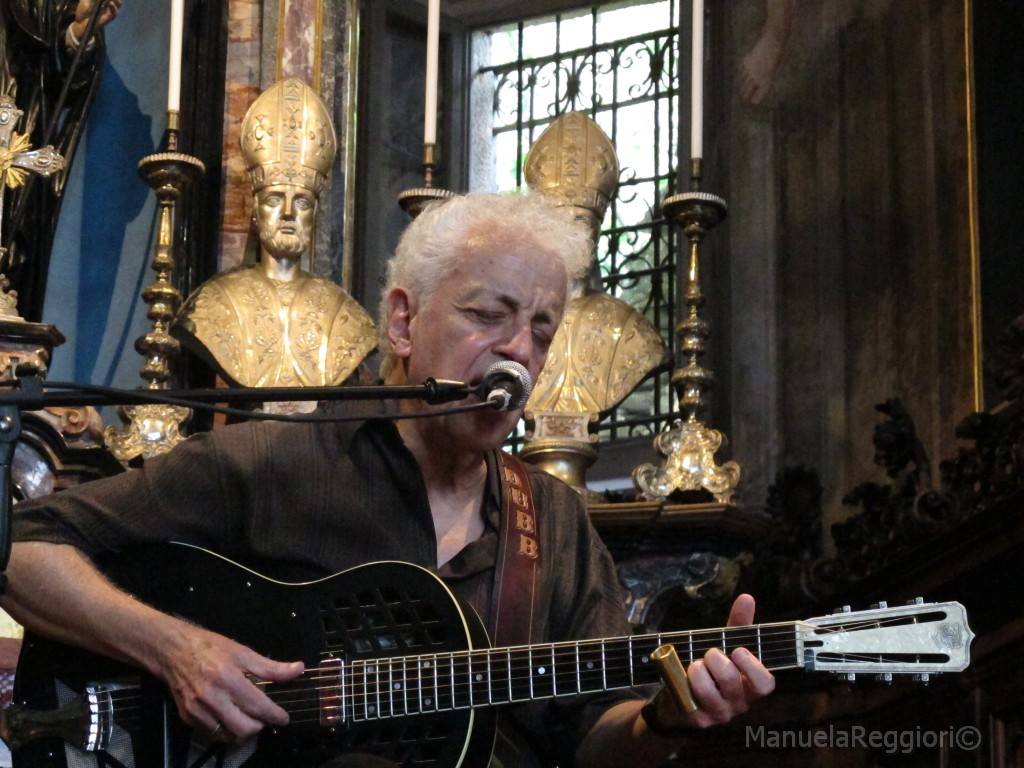 Poi il 10 luglio 2016, intorno alle 16, nella chiesa di Vacciago di Ameno, un grande maestro, il magico Doug MacLeod mi ha fatto scoprire che al blues nulla di ciò che è umano è estraneo. Anzi che quella musica è perfino "troppo" umana. Niente di trascendente, niente di divino o di demoniaco, solo lo specchio della Vita, sentimenti, pulsioni, pensieri, dolori, gioie, ambizioni e delusioni, riproposti su 3 accordi. Che non ti colpiscono solo la "pancia" o il "cervello", ma che suonati da uno come MacLeod sono colpi sotto la cintura che lasciano senza fiato. La sua classicissima National resofonica è un'arma d'assalto, così facile da amplificare (solo un piccolo taglio di -10db tra i 700 e gli 800 Hz come da buona norma). Il microfono, un 58 da battaglia, lo usa con una sapienza e una professionalità rara, che solo una lunga esperienza e una grande competenza musicale possono dare.
